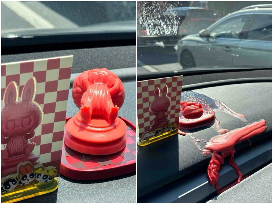 最近,“Labubu车内融化惨变Lababa”的图片在社交平台火了——有消费者晒出图片表示,私家车里放着Labubu造型的香薰蜡烛,经过夏日暴晒后变得面目全非。不少网友跟帖表示,不仅香薰蜡烛会变形,其他的塑胶摆件也可能因为阳光照射而走样。