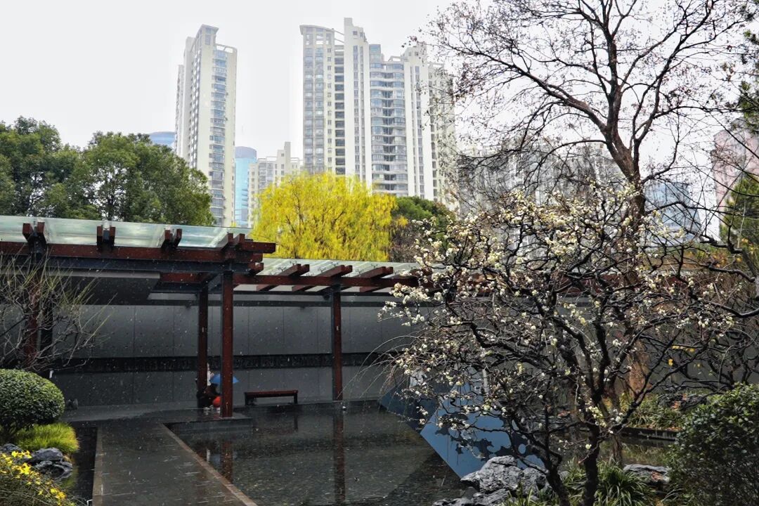 惊艳!静安雕塑公园梅雪同框!2026年静安第一波梅花悄然绽放