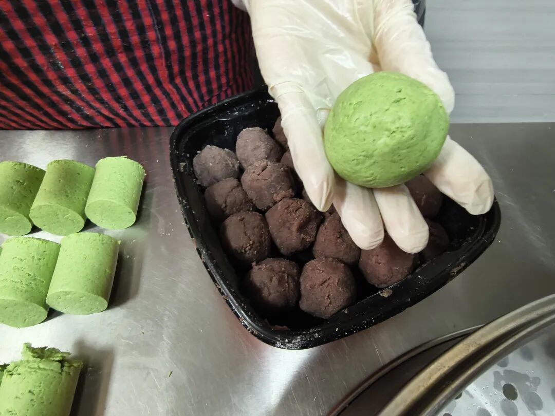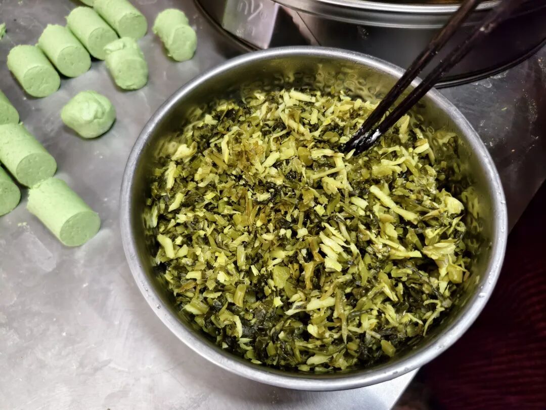 这家小作坊是姐妹俩从2019年开始经营的,就在顾村菜市场的一排商铺当中,她们给小店起了一个颇有本地特色的名称,叫作“鸣娘娘粮仓”。6年来,姐妹俩风雨无阻,始终坚守在这个“粮仓”,也始终坚持用自己的双手制作,就是想把顾村人的乡愁留住。她们说,顾村的老百姓都已经动迁当市民了,愿意自己动手做本地糕团的人也越来越少了,自己开这个小店、坚持用老祖宗的手艺、老祖宗传下来的材料和配方做糕团,就是想让大家记住“老底子”顾村的味道。比如青团,传统上就是用艾叶和糯米粉做的,其中艾叶就是传统青团的“灵魂”。