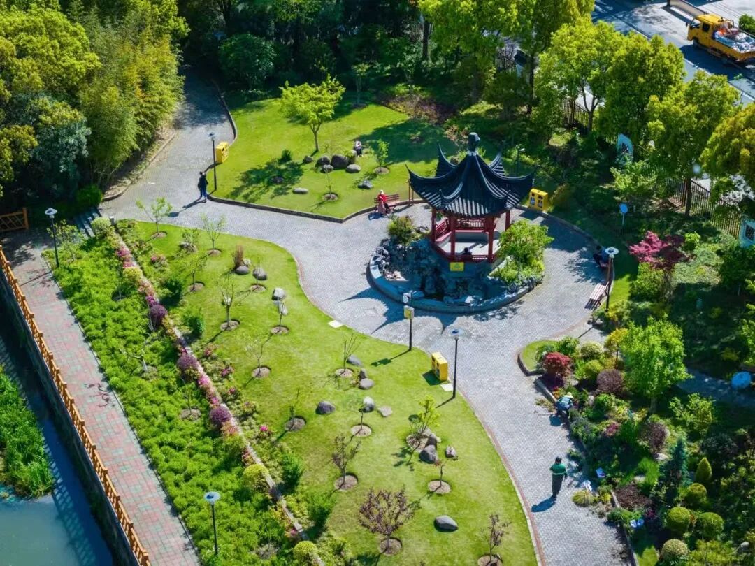 桃浦公园位于古浪路南侧、桃浦西路东侧,地块呈南北狭长状,总占地面积约1.5万平方米。公园采用江南古典园林风格,园内建有一座重檐石亭和一处临水的六角木亭,亭台水榭与春花相映成趣,成为市民游客休憩赏景的好去处。市民陈碧君有时会来公园跑步:“公园不大,但很精致。我喜欢春天来这里跑步,有种在‘小江南’的感觉。”